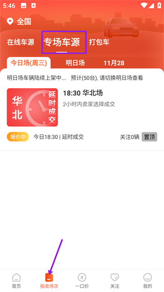 2、拍賣場次頁,聚焦專場車源拍賣,分今日明日場,展示區域拍賣場次,支持查看延時成交信息。