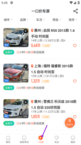 3、一口價頁,展示固定價格的二手車源,標注車輛上牌時間、里程等信息,支持按城市品牌篩選,車源處于限時出售狀態。
