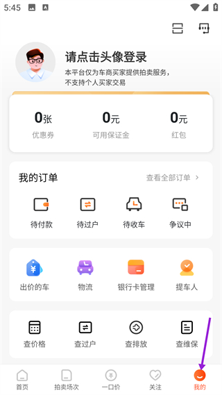 4、我的頁,需登錄使用,含訂單管理、出價車輛等功能,平臺僅服務車商買家,不支持個人買家進行交易。