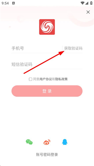 3、登錄選擇界面可選擇手機驗證碼登錄,輸入手機號、獲取并輸入驗證碼,勾選用戶協議和隱私政策后即可登錄。