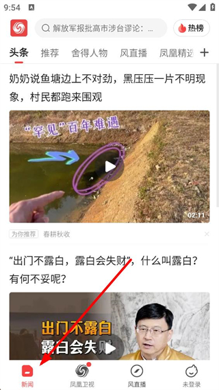 1、進入鳳凰新聞應用后,新聞頁面可瀏覽頭條、推薦等各類資訊,還有熱榜功能,能獲取熱點新聞和多樣內容。