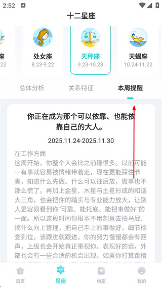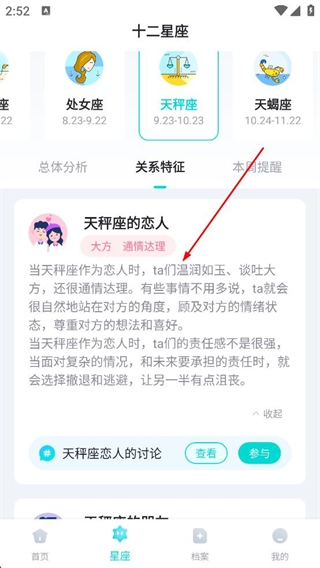 3、登錄后進入星座頁面選擇天秤座,切換至關系特征頁面,查看天秤座作為戀人的性格表現等內容。