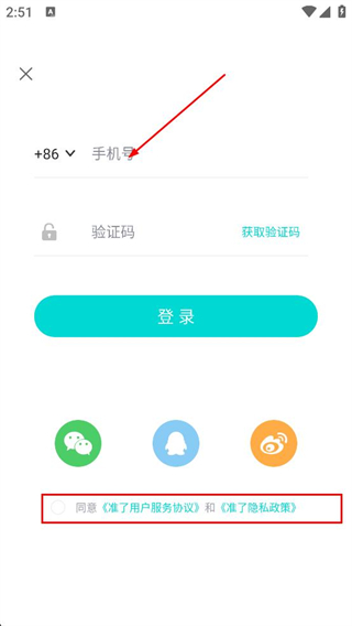 2、在登錄界面選擇手機號登錄方式,輸入手機號獲取驗證碼,勾選用戶協議和隱私政策,點擊登錄完成驗證。