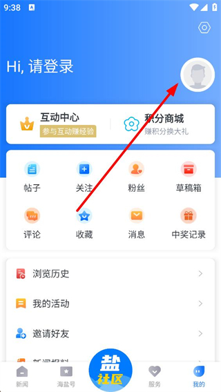 2、進入個人中心頁面,能看到互動中心積分商城等功能模塊,點擊右上角頭像,即可進入登錄界面,開啟賬號登錄的流程。