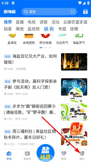 1、進入愛海鹽首頁,可瀏覽推薦類新聞內容,底部有新聞海鹽號等功能入口,點擊我的選項,即可進入個人中心頁面,準備后續操作。