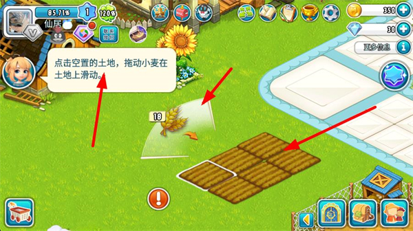 3、點擊空置的土地,拖動小麥在土地上滑動進行種植,完成農作物的播種操作,擴大農場種植規模。
