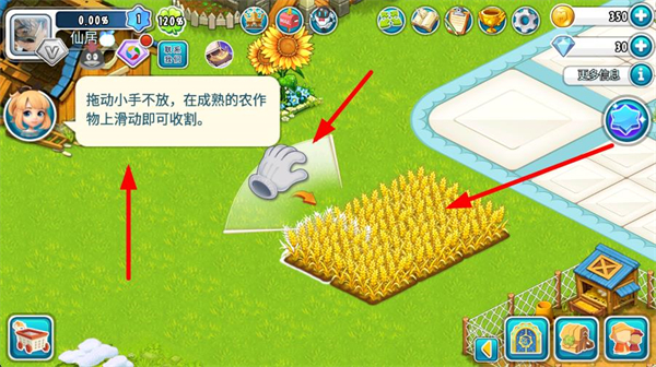2、農作物成熟后,拖動小手在成熟的農作物上滑動即可收割,通過收割獲取農作物資源。