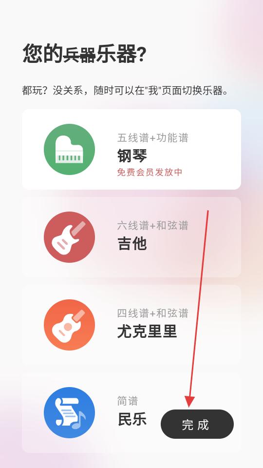 1、打開有譜么app,進入樂器選擇頁,瀏覽鋼琴、吉他等樂器選項,選定后點擊完成,進入APP主界面。