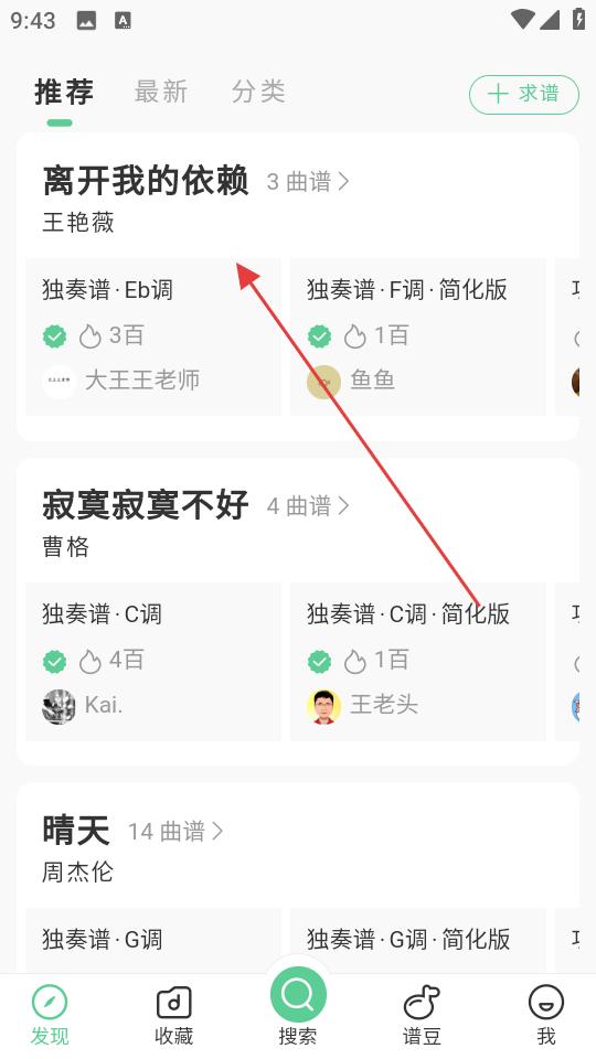 2、在主界面發現頁,瀏覽推薦曲譜,找到感興趣的歌曲,如離開我的依賴,點擊進入曲譜列表。