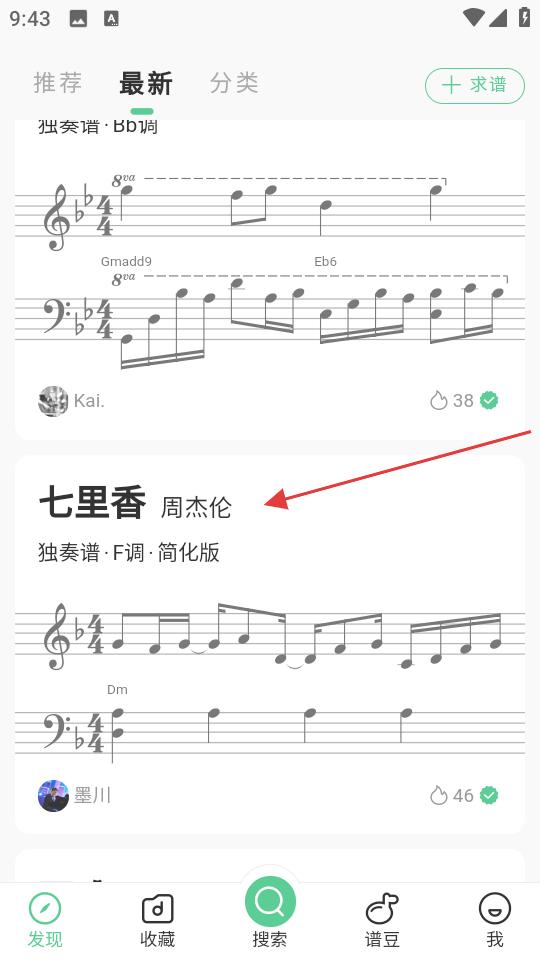 3、切換到最新板塊,查找想聽的歌曲譜子,如七里香,點擊進入,查看該曲譜的詳細內容,準備使用。