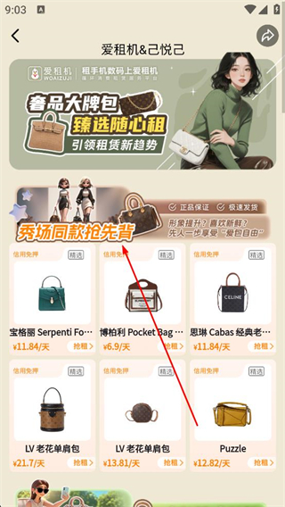 3、切換至愛租機悅己板塊瀏覽奢品品牌包的租賃內容,選擇秀場同款搶先膏分類下的包袋,查看不同款式包袋的租賃價格及相關服務。