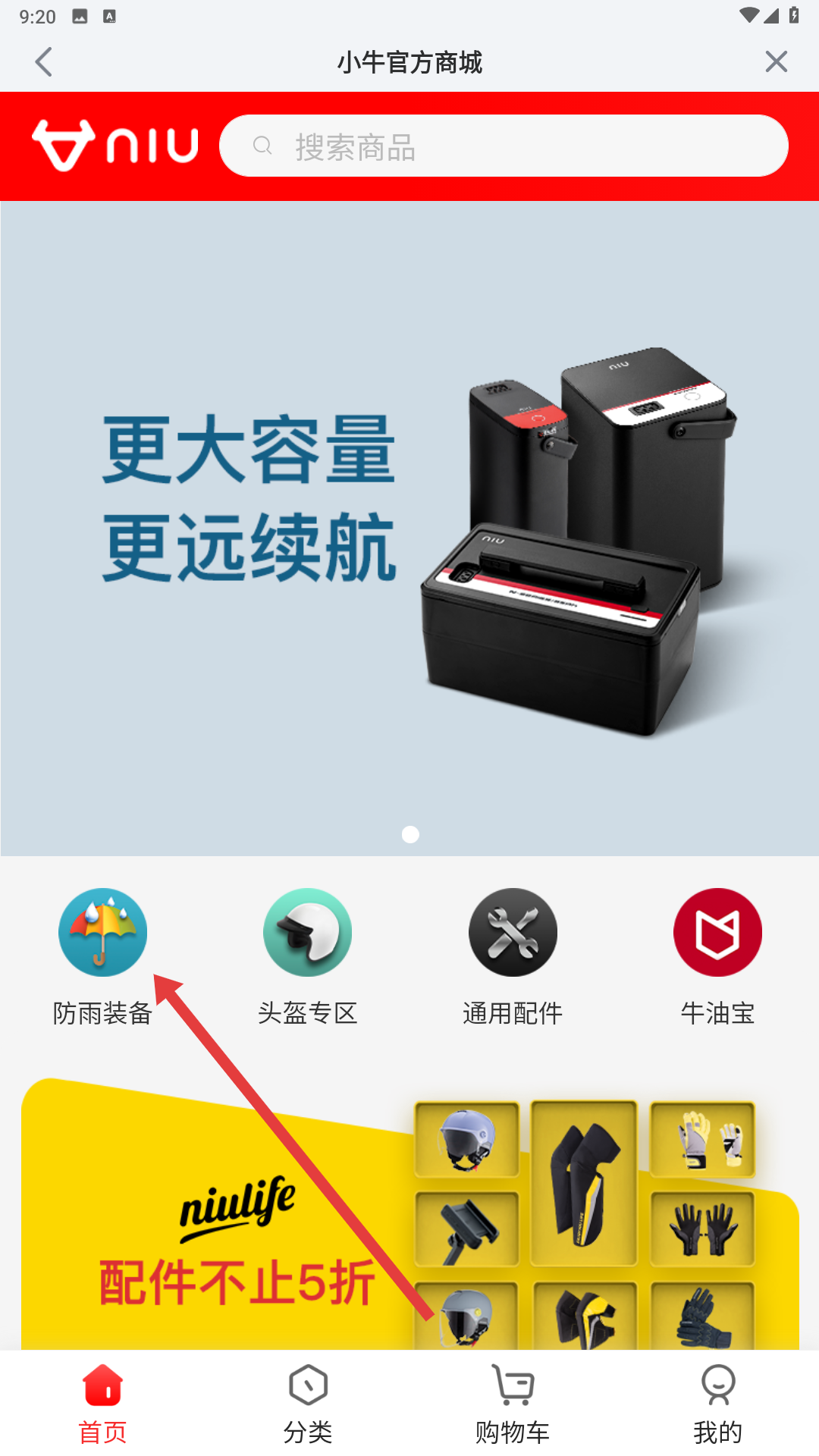 1、APP底部導航欄點擊商城,可進入小牛官方商城界面,瀏覽各類電動車相關商品。
