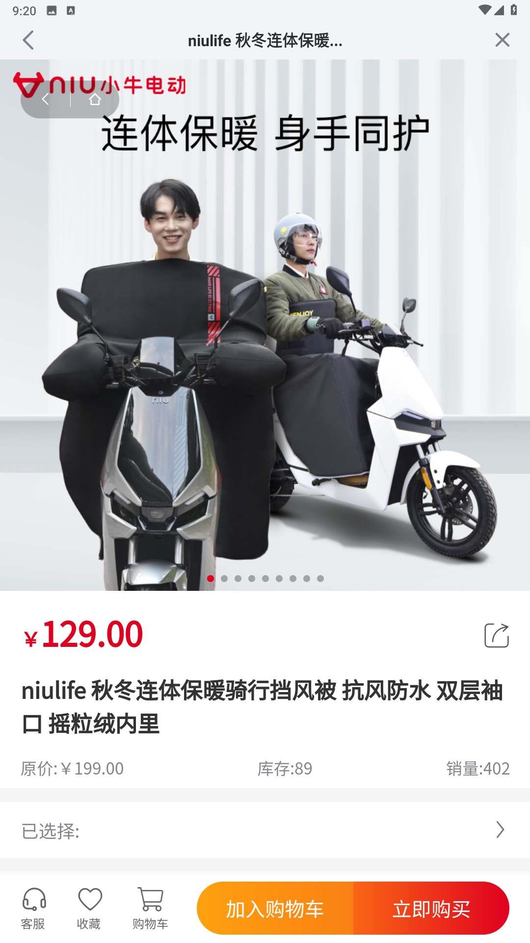 3、商品列表中點擊niulife秋冬連體保暖騎行擋風被,可進入該商品的詳情頁面,查看商品價格、庫存、銷量等信息。