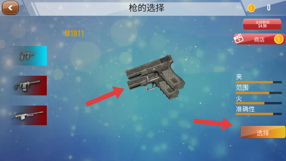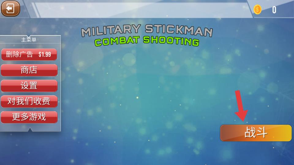 1、進入游戲,看到主菜單界面,有商店,設置等選項,點擊戰斗,即可進入槍械選擇環節。