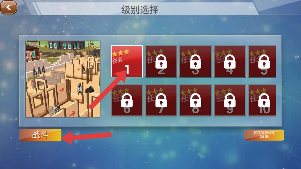 3、槍械選好后,進入級別選擇界面,選擇要挑戰的任務級別,再點擊戰斗,進入具體戰斗場景。