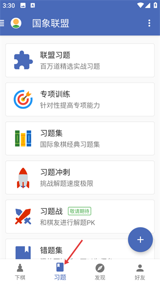1、習題頁有聯盟習題、專項訓練等入口,含經典習題集等模塊,可系統提升國際象棋解題能力。