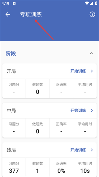 2、專項訓練頁按開局等階段劃分,展示各階段做題數據,支持點擊開始訓練,針對性提升對應階段棋藝。