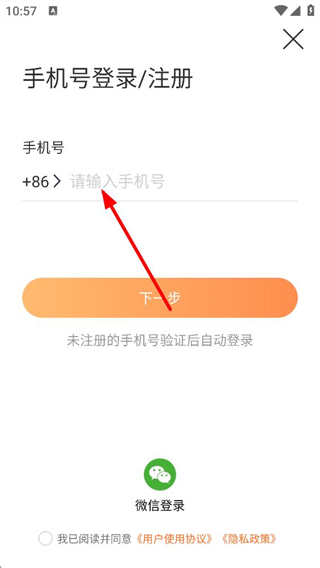 3、個人中心點擊登錄、注冊后,進入手機號登錄、注冊界面,輸入手機號并勾選協議后可繼續操作,未注冊手機號驗證后自動登錄。