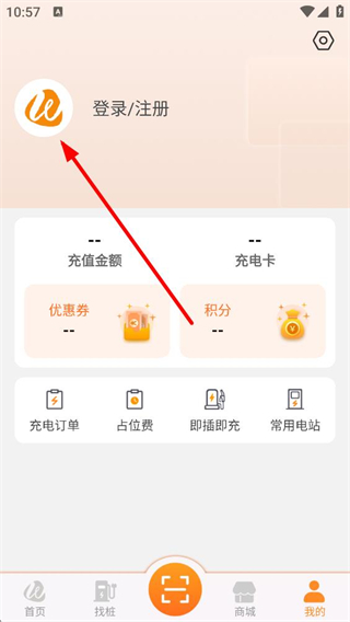 2、點擊底部我的進入個人中心,可看到登錄、注冊入口,還能使用充電訂單、占位費等功能,管理充值金額、充電卡等個人充電相關資產。