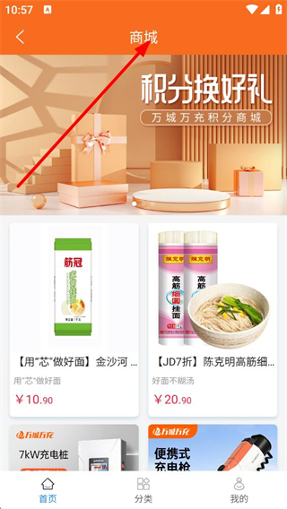 4、點擊底部商城進入積分商城,可使用積分兌換商品,包含食品、充電設備等品類,通過充電積累的積分可兌換對應好物。