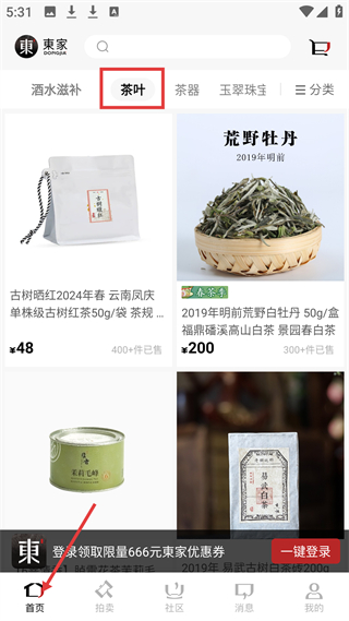 1、首頁茶葉分類展示古樹曬紅、荒野牡丹等商品,標注價格及銷量,用戶可瀏覽選購,還有登錄領取優惠券活動。