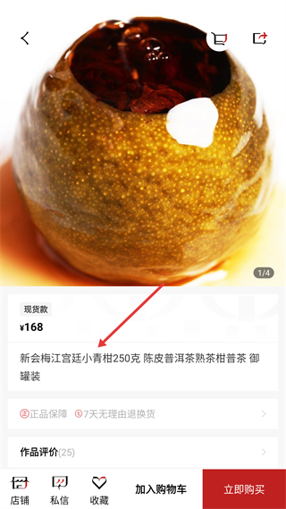 3、新會梅江宮廷小青柑商品詳情展示圖片、價格,提供正品保障、7天無理由退換貨服務,用戶可加入購物車或立即購買。
