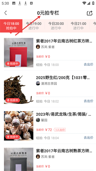 4、0元拍專欄展示云南古樹紅茶方磚、野生紅等茶葉拍賣標的,標注當前價、結拍時間,用戶可參與0元起拍的茶葉競拍。