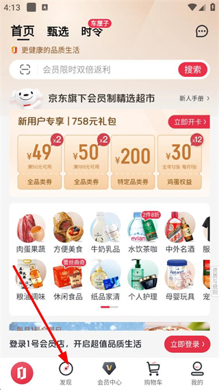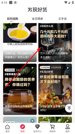 1、首頁點擊底部發現按鈕,可進入發現好貨頁面,這里包含如何選購會員曬單等板塊,展示各類生活消費相關的內容。