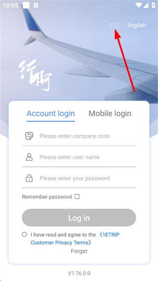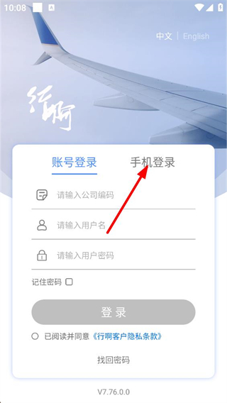 1、進入行啊登錄頁,可切換中英文顯示,選擇賬號登錄模式需依次輸入公司編碼、用戶名、密碼,勾選相關隱私條款后,即可點擊登錄按鈕推進流程。