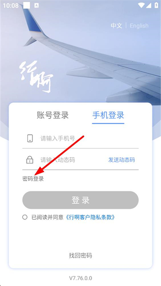 4、手機登錄模式下切換至密碼登錄,需輸入手機號與對應的用戶密碼,勾選行啊客戶隱私條款后,點擊登錄按鈕,即可完成登錄進入應用。