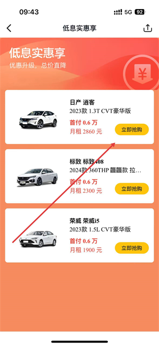3、進入低息實惠享頁面可查看日產逍客、標致408等車型的優惠購車信息,點擊立即搶購可參與優惠活動。