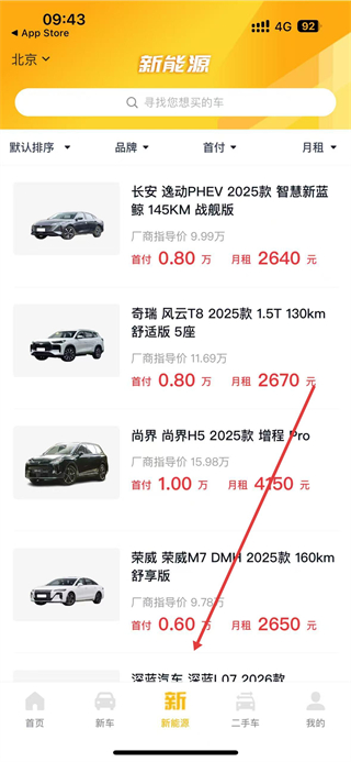 2、在新能源頁面可查看長安逸動PHEV、奇瑞風云T8等新能源車型,了解首付和月租信息。