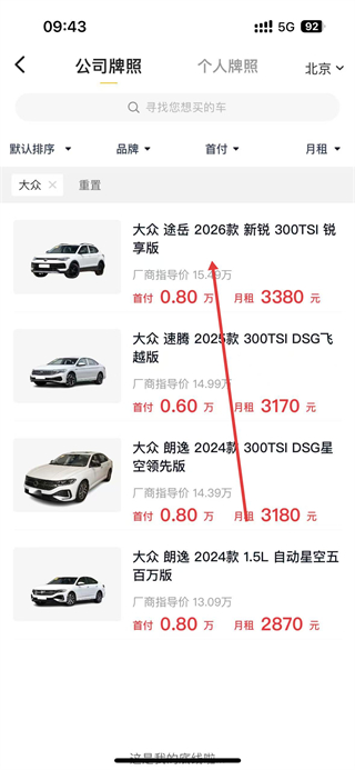 4、在公司牌照頁面可查看大眾途岳、速騰等車型,了解廠商指導價、首付和月租信息,選擇心儀車型進行購買。