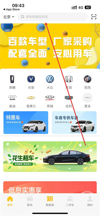 1、進入花生好車app首頁可查看奔騰、長安等汽車品牌,點擊搜索框可搜索想要購買的車型。