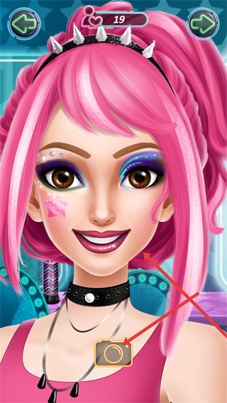 4、可更換角色的發型、配飾,如粉色發型、帶鉚釘的發箍和項圈等,搭配好后還能點擊相機進行展示。