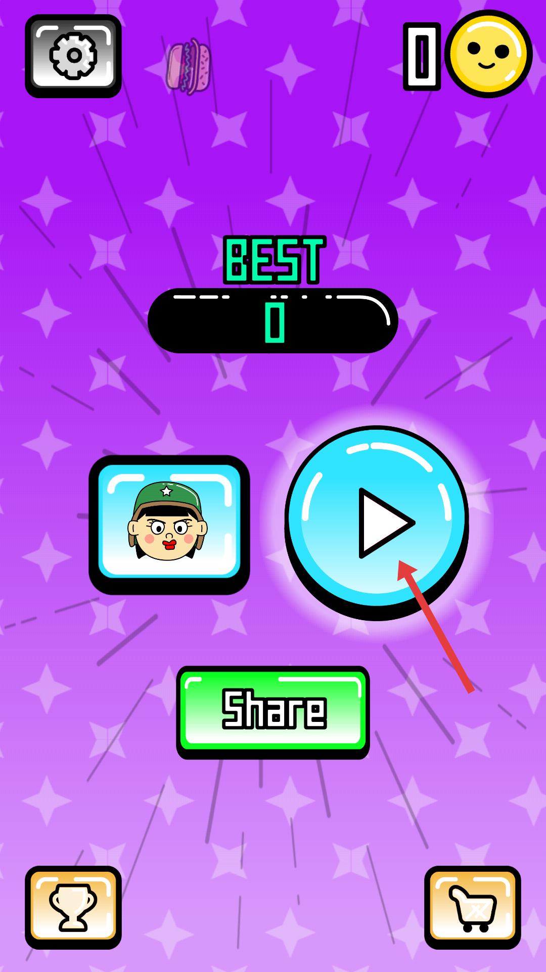 1、游戲主界面點擊藍色圓形帶白色三角形的開始按鈕,進入游戲開啟挑戰,爭取獲得高分。