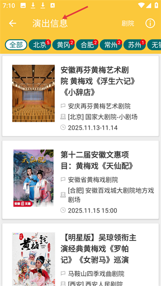 2、演出信息板塊可查北京、合肥等多城黃梅戲演出,如浮生六記、天仙配等,含演出時間地點信息。