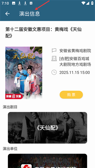 3、演出詳情板塊以天仙配為例,示演出單位、地點、時間,可購票,還介紹演出劇目與單位背景。