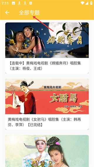 4、全部專題板塊有嫦娥奔月、女駙馬等黃梅戲電視劇唱腔集,方便用戶欣賞經典黃梅戲唱腔。
