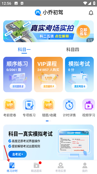 1、進入應用先看到科目一相關功能,有順序練習VIP課程模擬考試等選項,點擊底部練習計時,可開啟科目一的練習計時模式。