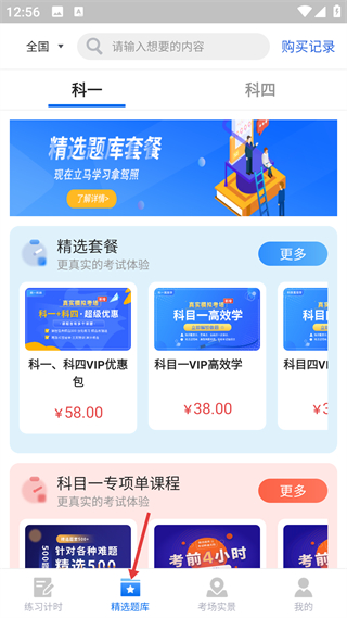 2、切換到精選題庫界面,能看到科一科四的精選套餐和專項單課程,可根據自身需求選擇對應的課程套餐學習駕考知識。