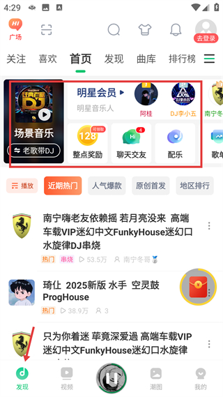 1、首頁整合場景音樂明星會員等功能入口,展示近期熱門DJ串燒內容,是音樂內容瀏覽與功能訪問的核心入口。