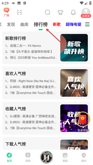2、排行榜頁面含新歌喜歡等多維度榜單,呈現不同維度的音樂熱度排名,是了解熱門DJ音樂的集中展示頁。