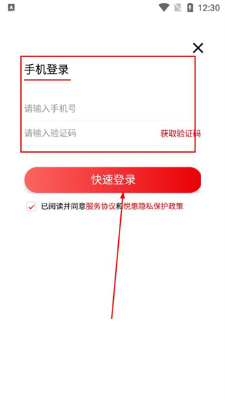 1、打開軟件進入手機登錄頁面,填寫手機號并獲取驗證碼填入對應框,勾選協議后點擊快速登錄按鈕完成賬號登錄操作。