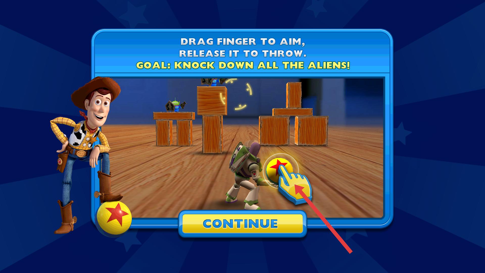 2、游戲開始前查看操作提示,需拖動手指瞄準,釋放手指投擲,目標是擊倒所有外星人,點擊CONTINUE進入游戲。