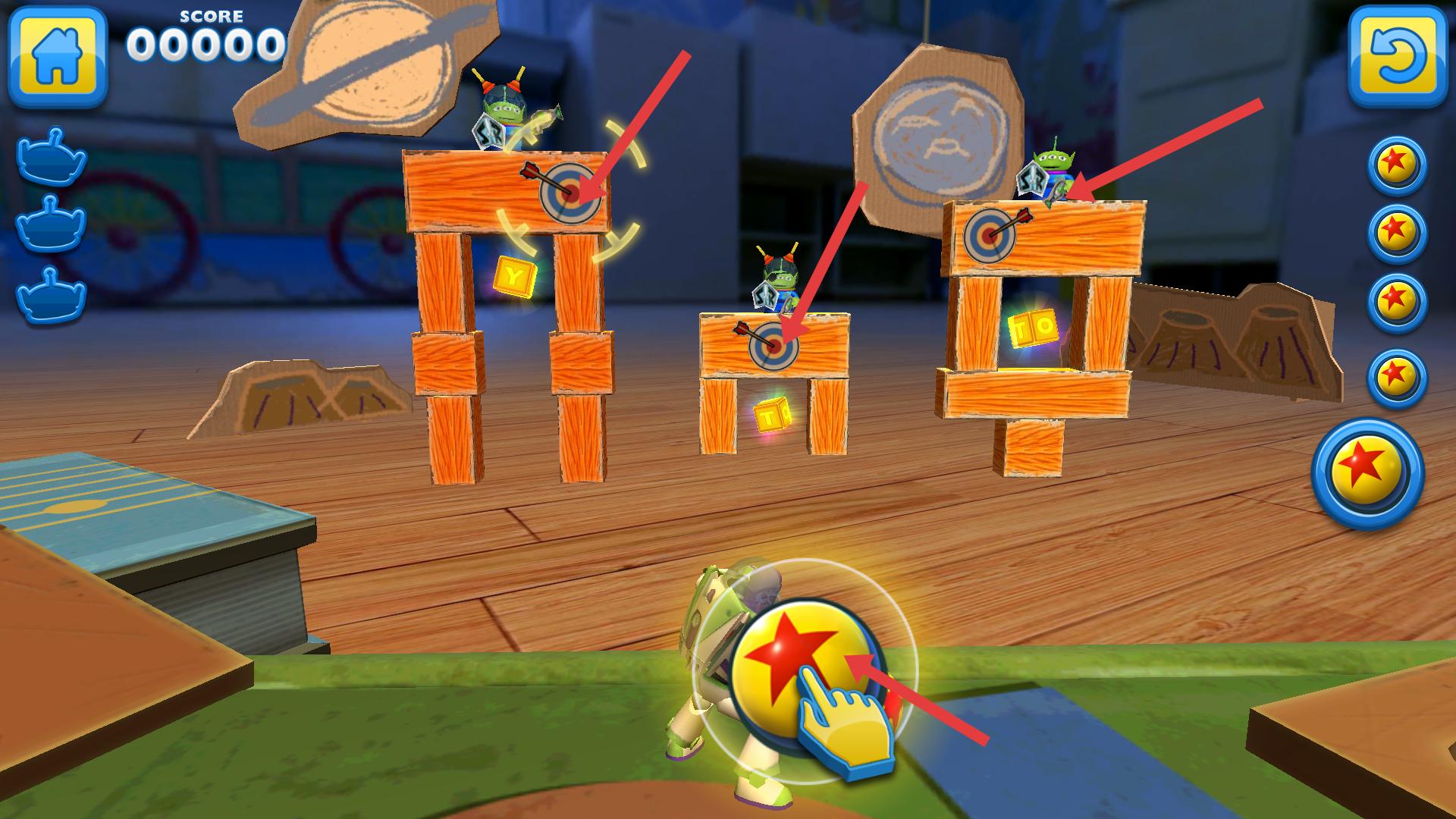 3、進入游戲后拖動帶有紅星的球瞄準,優先攻擊有外星人的木塊結構,同時盡量擊中靶子,獲取更高分數和獎勵。