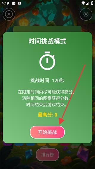 1、進入游戲看到時間挑戰模式界面,點擊開始挑戰按鈕,進入游戲場景準備在限定時間內消除方塊獲取分數。
