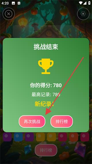 4、當時間結束挑戰結束后,會出現顯示得分的界面,若對本次得分不滿意,可點擊再次挑戰按鈕,重新進行方塊消除挑戰。