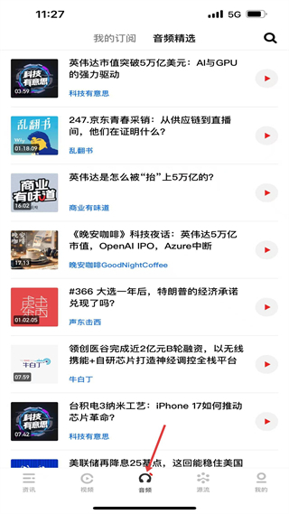 3、音頻界面分多個板塊,展示英偉達、京東等音頻內容,用戶可收聽各類音頻資訊,底部功能入口相同。