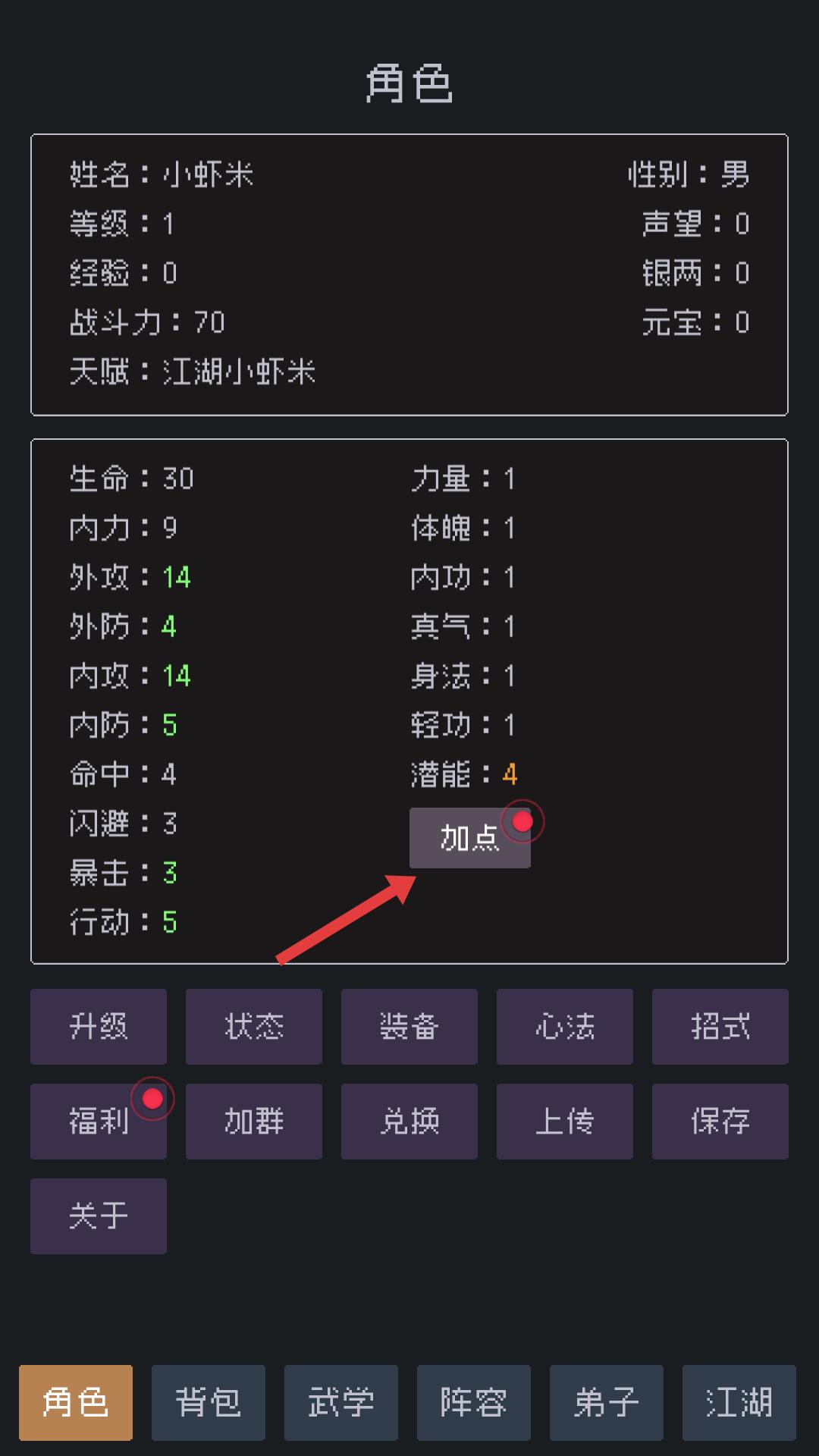 2、在角色界面,點擊加點,分配4點潛能,優先強化外攻、內攻屬性,提升初期戰斗力。